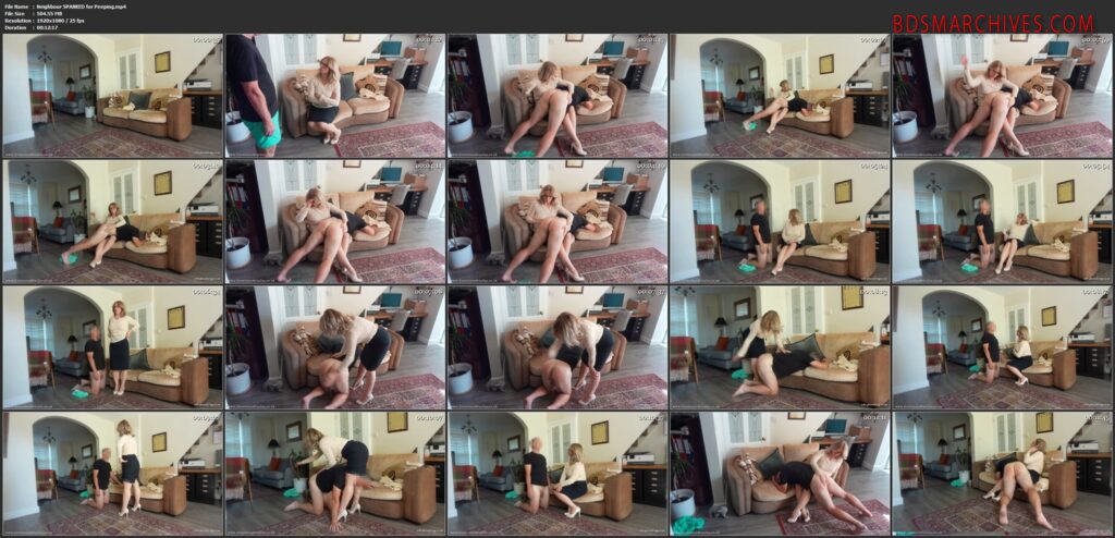 My neighbour is a bad boy! Second time I caught him in my garden peeping in my windows. This time I was getting dressed and the needs to be taught a lesson. I hastily put my top on and chase him in the garden. I pull him in and spank him in several positions, over my knee both ways, him kneeling and even him kneeling with his head held in place with my legs. In the end I confiscates his shorts and send him back home with bare bottom.