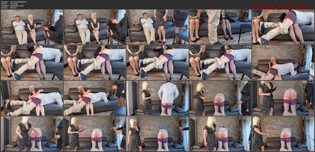 Miss Stinger is a counsellor for couples with some very unusual methods. When Sam Johnson comes to see her with her lazy husband, Miss Stinger tells her it’s an easy problem to correct, then wastes no time in putting him over her knee to demonstrate how to give him a sound spanking! Miss Stinger then instructs Sam to spank him too. They then give him a double paddling, and a double caning which leaves his bottom very stripey and sore. Needless to say, he promises to change his ways!