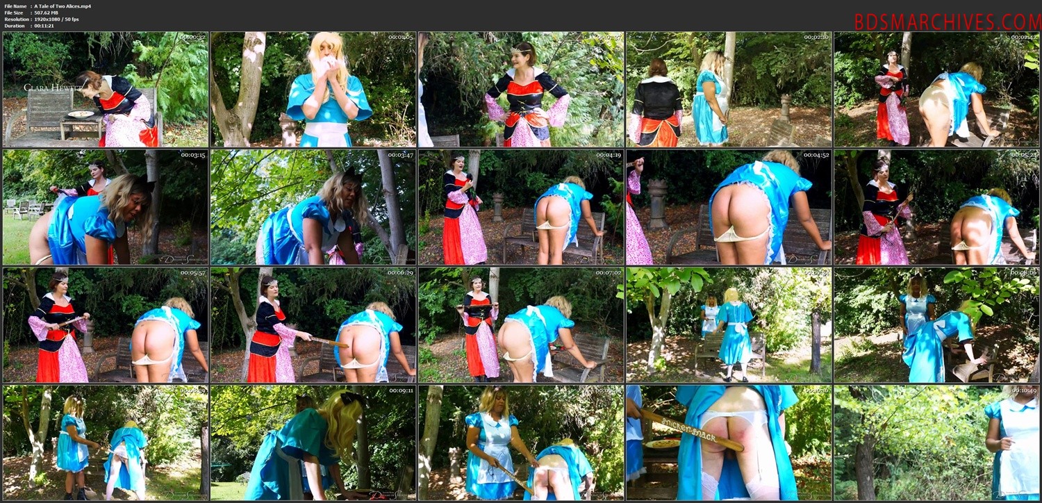 Alice has been living in the Red Queen’s court, working as a maid and doing her best to behave – but little does she know, her looking-glass double is sneaking around the royal rose garden tonight! When the Queen sees Alice steal one of her infamous tarts, she’s quick to punish the girl: a heavy flogging with a thorny implement made from her own rose bushes, and a particularly nasty paddle to drive the lesson home.