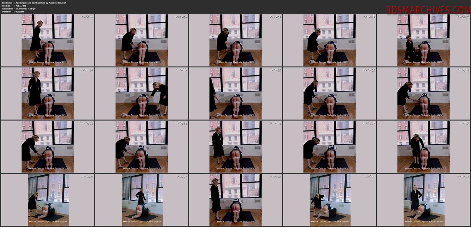 The weeping and age-regressed Amy must now kneel while Auntie Dolores applies the long spanking implements. Amy becomes tired and bratty. She tries to hit Auntie back. Amy’s reaction is so ineffective it’s cute. Auntie Dolores’ paddles become longer and crueler. Amy’s bottom is bruised, and she writhes in pain on the ground. Auntie Dolores is pleased with how submissive and subdued Amy has become while disciplined in the age-regressed entrancement.
