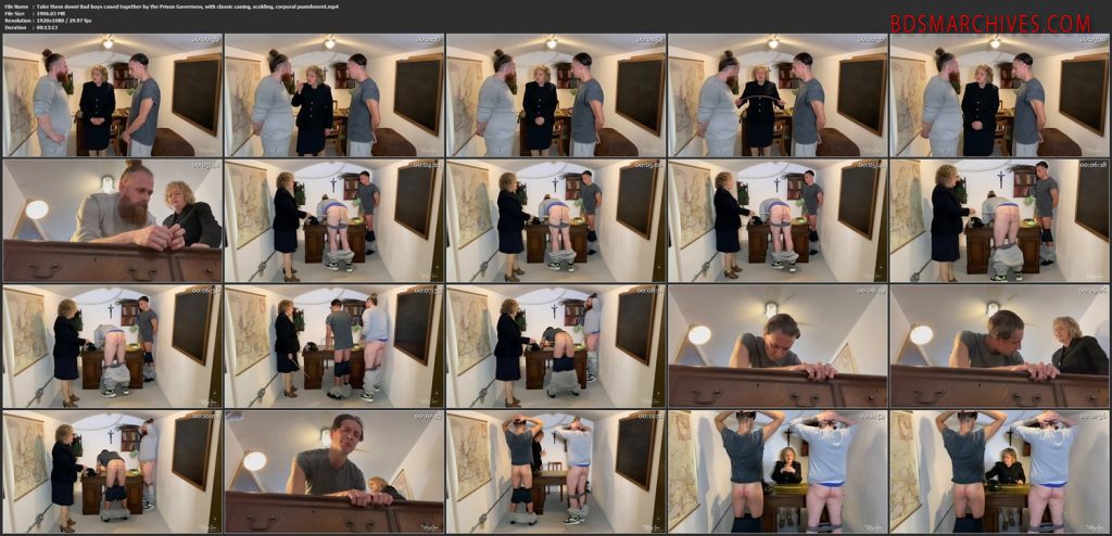 Take them down! Bad boys caned together by the Prison Governess, with classic caning, scolding, corporal punishment.