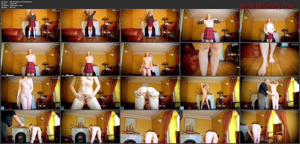 I’ve been called to the principal’s office because my grades aren’t where they were a term ago, but he decides to perform a FULL INSPECTION of my uniform. Which is a disaster – I’m not wearing a bra, and my panties aren’t the regulation white cotton ones. He’s so displeased that he then insists on an INTIMATE INSPECTION too, which involves having to spread my pussy and ass as well. The SHAME OF IT. And then, he decides to cane me for my poor performance all around. 12 strokes, in an embarrassing, legs-apart position, while fully nude!