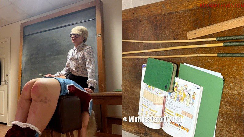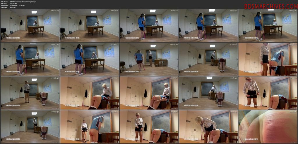 Teacher Baton is in her classroom, dressed in Wolford nylons, stilettos, a leatherette skirt and satin blouse when she receives some disturbing news – student Alisha’s anger management issues has caused yet another incident at school. It turns out she beat up an opponent who irritated her during a hockey match. Petite blonde Alisha is in her school’s blue hockey uniform, a t-shirt, shorts and trainers. She needs to be taught a lesson. Teacher orders her to stand with her nose against the wall while she moves the desk out of the way for the caning that will follow. She is ordered to drop her shorts and panties and to bend over the gymnastics bench. As the strokes get harder, she squeals and whimpers.