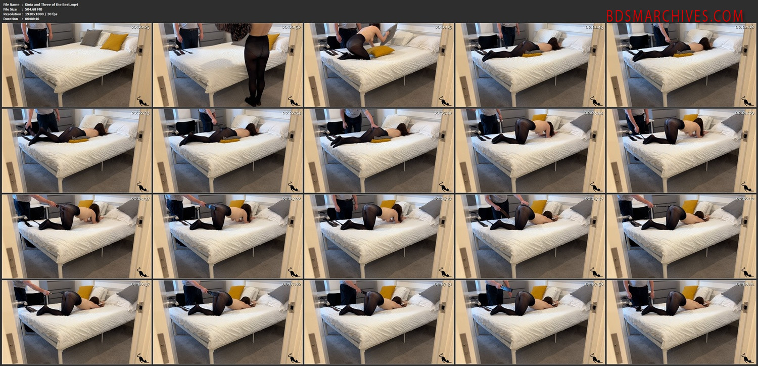Kinia and Three of the Best – Topless and in just panythose and white panties, Kinia stretches across the bed, bottom raised to allow her Top to try out three of his favourite leather implements.
