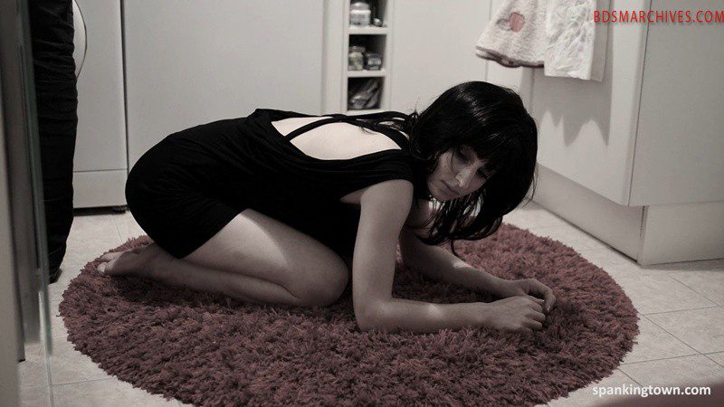 Kitty is set on her rug, waiting for her punishment. The lovely brunette admit to be a 100% submissive bitch and she loves to be tamed. Doggystyle in her little black dress, she arches her back to be a better target for spanking. Soon, the dress is up her butt, showing a nice black thong and a slutty bubble butt. Kitty moans with each strike on her ass. Her master is in charge, spanking the bitch a lot, and even having his shoe on her back while doing it. When you have a subby cunt at your disposal, it’s better to use it. That’s how the filthy bitch has to lick and clean her master’s shoe. As a reward, Kitty is fingered and her reactions leaves no doubt about her pleasure. Kitty has to lick his shoe again while being flogged by a leather belt on her butt. To finish this, Kitty exposes her pussy and ass to the camera.Still doggystyle and panty on the side, Kitty is spanked again, and her master gropes and spread her pussy. The brunette bitch is touched and humiliated, the guy pulling her pussy lips, as her thong doesn’t hide anything of her private parts. Then the lingerie goes away, and Kitty is masturbated. Then she takes a finger inside her ass and get some more spanking. Playing with the leather belt, her master has fun with her pussy, and obviously, this little slut loves it. So this nice bubble butt is flogged again, even when the bitch is hold down with a foot on her head. This session ends with a finger in her ass, more spanking and once more, a foot on her face. When the master leaves, the cunt is too stupid to move and keeps the position, waiting with the ass in the air and her pussy showing…