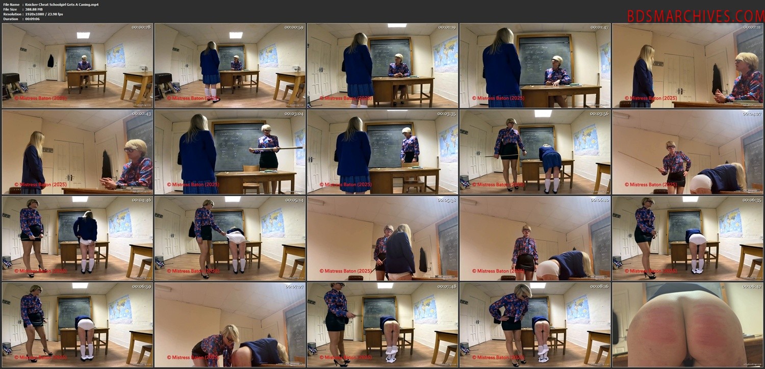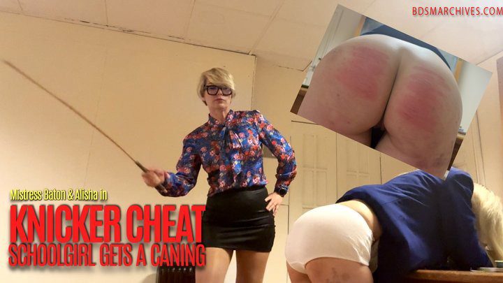 Rebellious Alisha is at it again… playing truant and causing disruption in class whenever she can. When the petite blonde arrives for a punishment, Headmistress Baton discovers yet another trick up her sleeve… wearing 2 panties to soften the blows of the cane. She gets 18 strokes and whimpers as the rod hits her bare perky bottom.