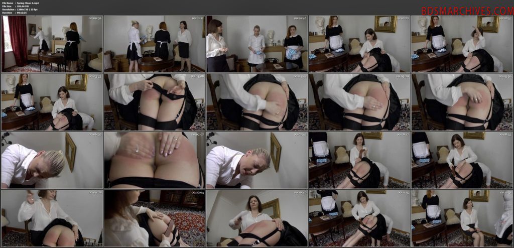 After a stinging spanking, Charlotte and Emily are finally cleaning as they were instructed. Miss Mathews is still not happy, however, and selects Charlotte to go first for another hand spanking. Over the teacher’s knee, poor Charlotte shivers in pain as she is spanked on her tender sit-spot, then moans in agony as Miss Mathews takes a heavy leather strap to her sore, pink cheeks.