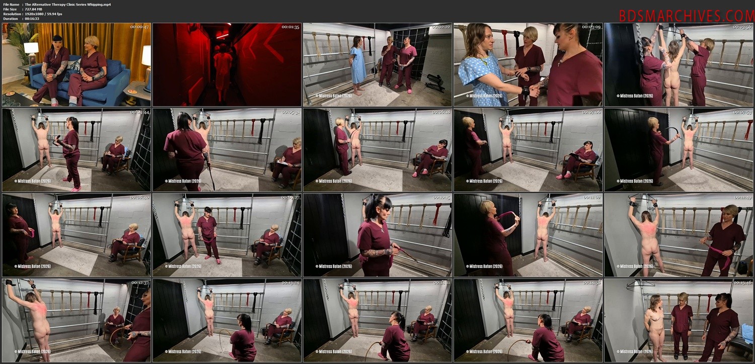 Having tried all conventional therapies to no avail, Alexia finds herself in front of Nurses Baton & Graves for a whipping. Because she still thinks about masturbating, her pussy and sex non-stop. She is stripped and restrained to the metal frame on the wall. First up is the heavy leather camel whip, strokes from both nurses rain down increasingly hard on her back. A dragon tongue, double as sore, is used next and she has a hard time enduring it. Her legs give way from under her. A vicious snake whip is the final implement to help her snap out of her obsessive sexual desire.