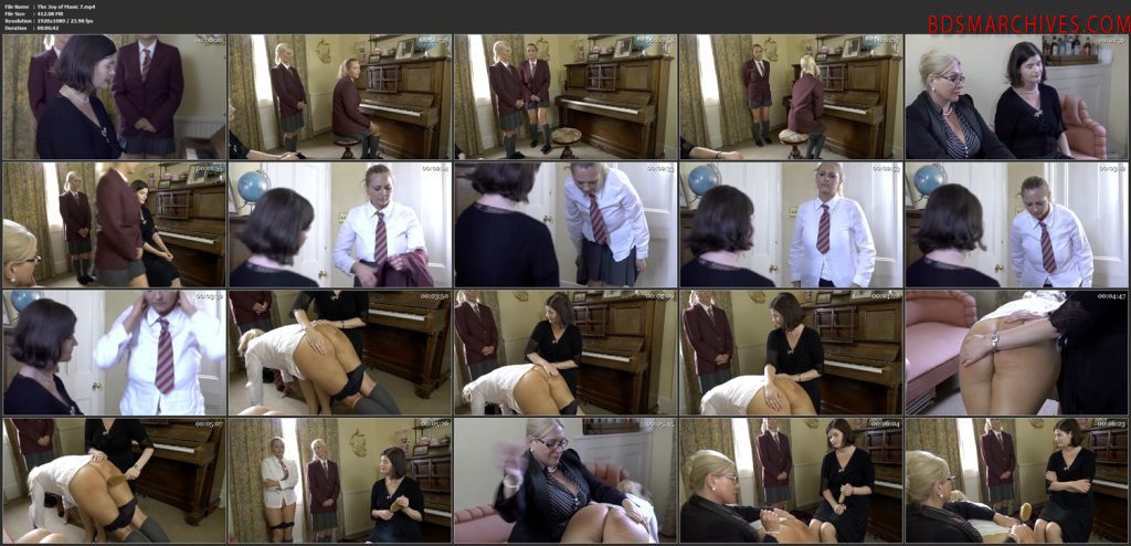 After their hard punishment yesterday, Margaret and Susanne are back in class for their piano recitals. Of course, neither has practised, leaving their teachers sorely disappointed in their horrible performances. Shaking their heads in disgust, Miss Mathews and Miss Sullivan promise these lazy schoolgirls a hard spanking with the teacher’s hairbrush. Margaret goes first over each teacher’s knee, squirming about and whimpering in agony whilst her tender, sore bottom is doubly hand spanked and paddled.
