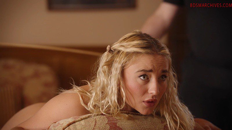 Of course, she chooses the punishment – she cannot afford to get expelled! She is dressed in her regulation uniform of a short tartan skirt and a white blouse. She is shown in to the disciplinarian’s study, where he explains to her what her punishment is to be. First she must stand in front of him and take her panties down to her knees. She stands humiliated for a while before he orders her to go over his knee. He then administers a painful and prolonged hand spanking. She kicks with her legs and bare feet and squirms under the blows, but he holds her down tight.